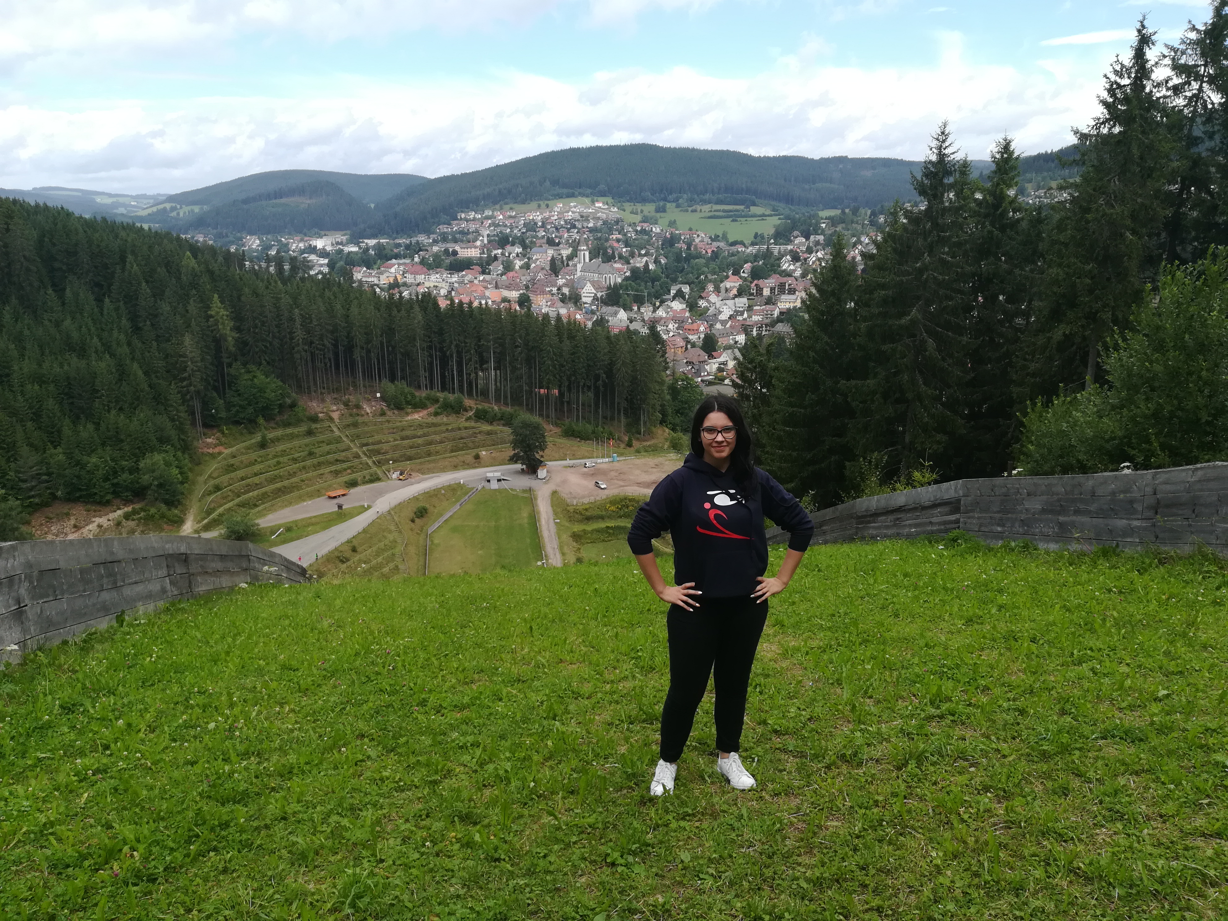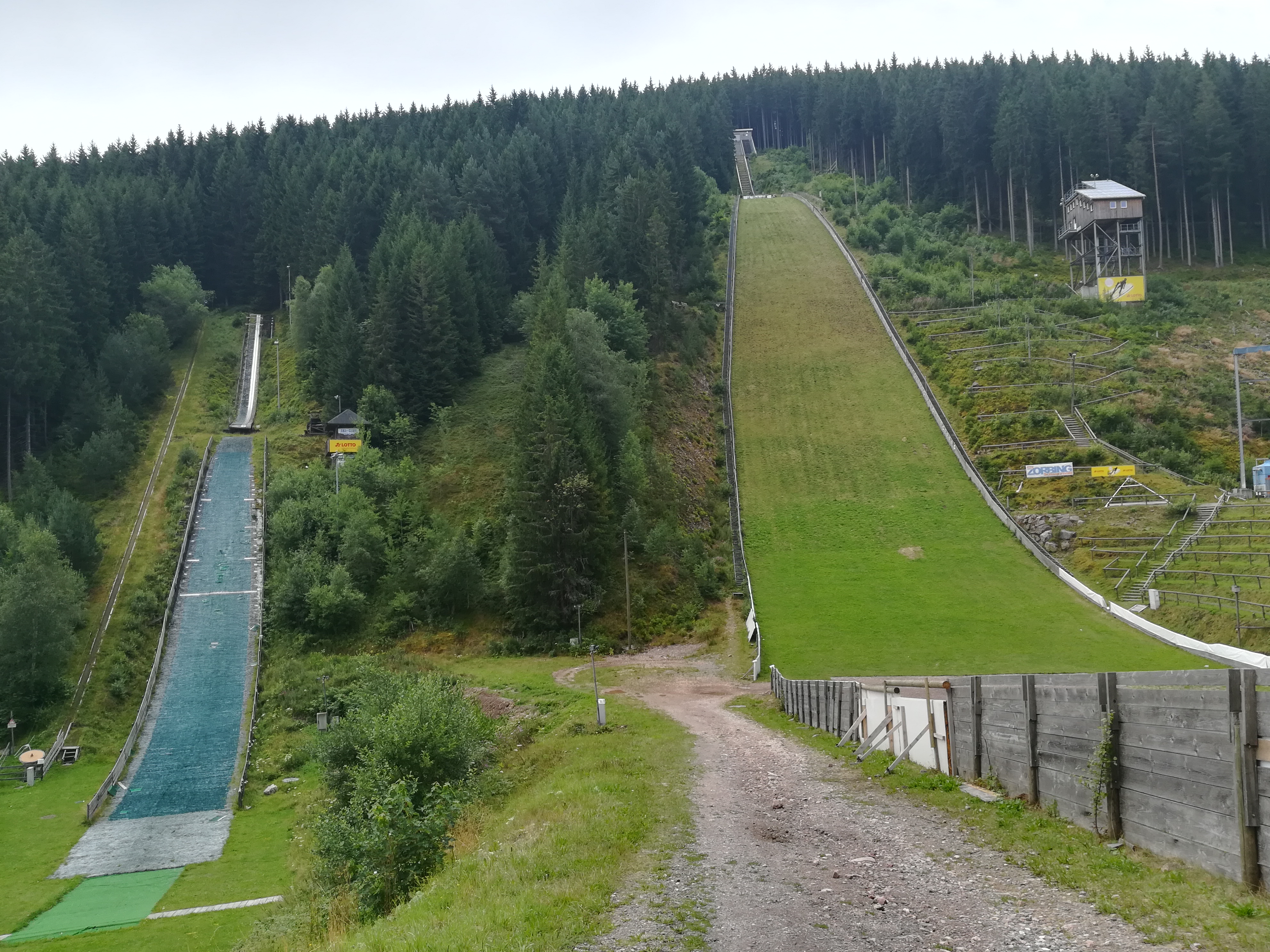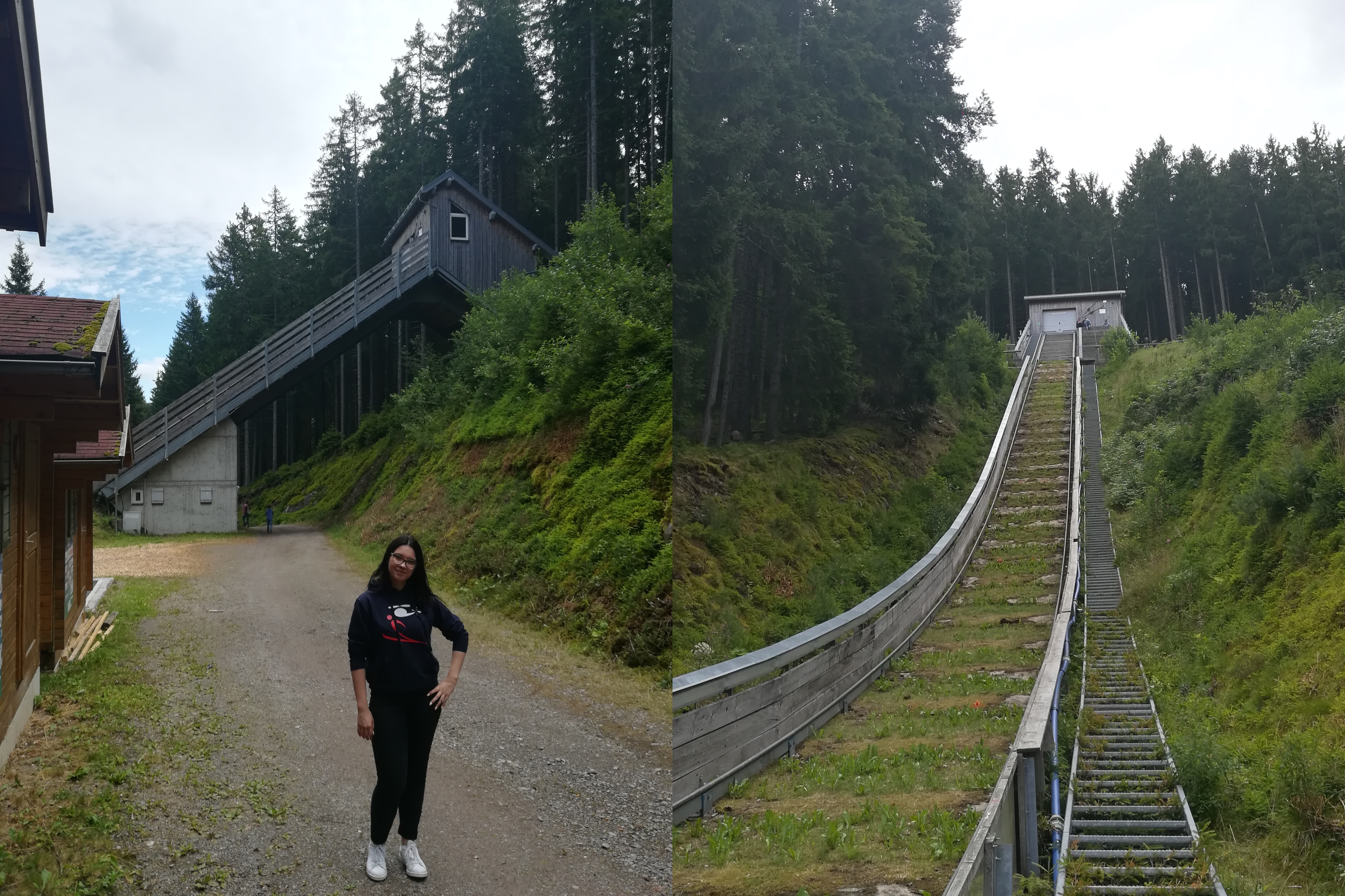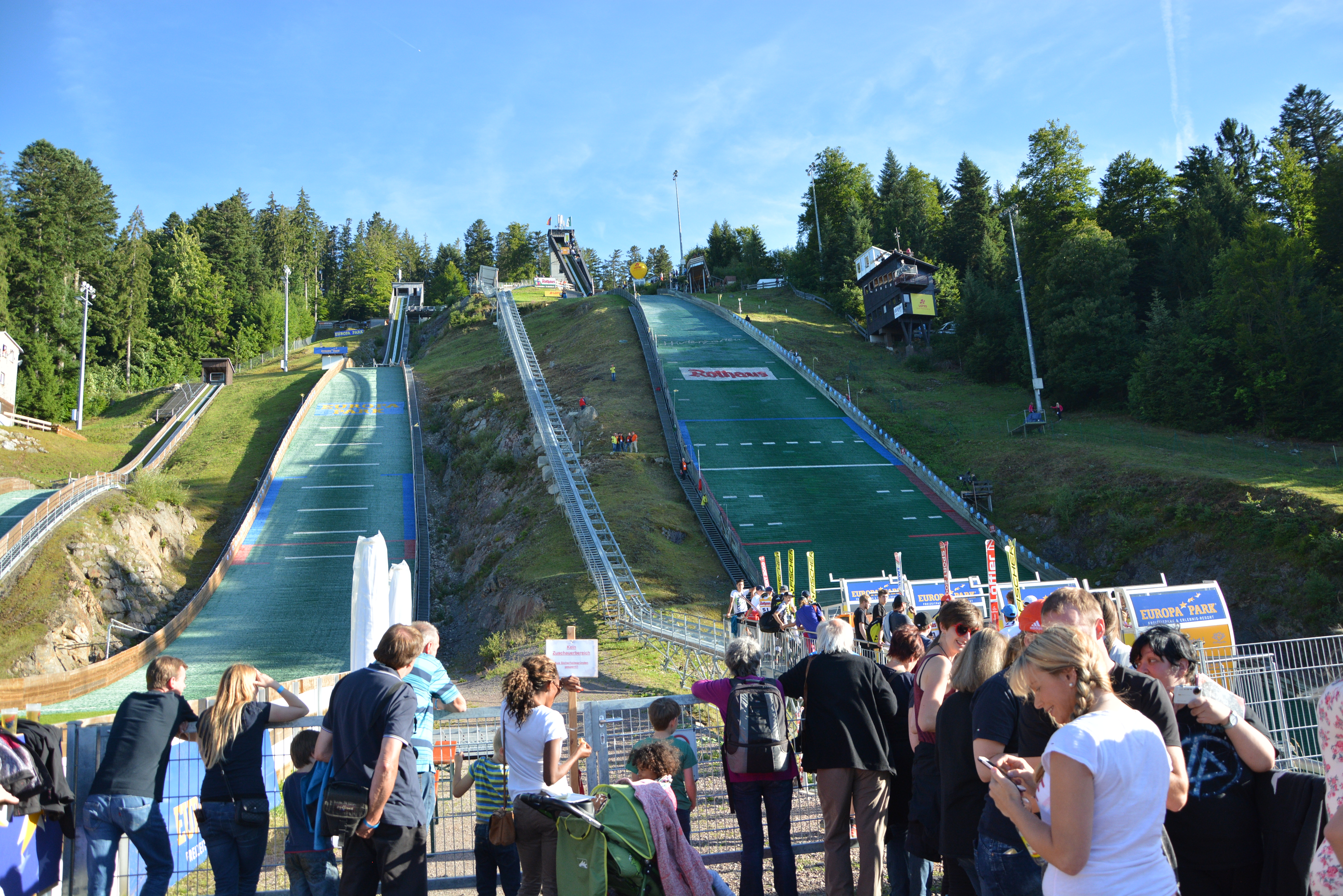 Zawody zaplanowane były dopiero na wieczór, więc aby nie marnować dnia, razem z rodzicami udałam się na zwiedzanie skoczni w Titisee-Neustadt.  Jest to zdecydowanie jedna z głównych atrakcji regionu. Sam kompleks znajduje się w Neustadt i dojazd do niego z Hinterzarten zajmuje około dwudziestu minut. Bez dobrej nawigacji się jednak nie obejdzie, bo nawet jeżeli uda nam się bez problemu wjechać do miasta, długo nie będzie można zobaczyć żadnych oznaczeń prowadzących na skocznię. Gdy jednak znaleźliśmy drogę, naszym oczom ukazała się… No właśnie, nie wiem jak to określić.