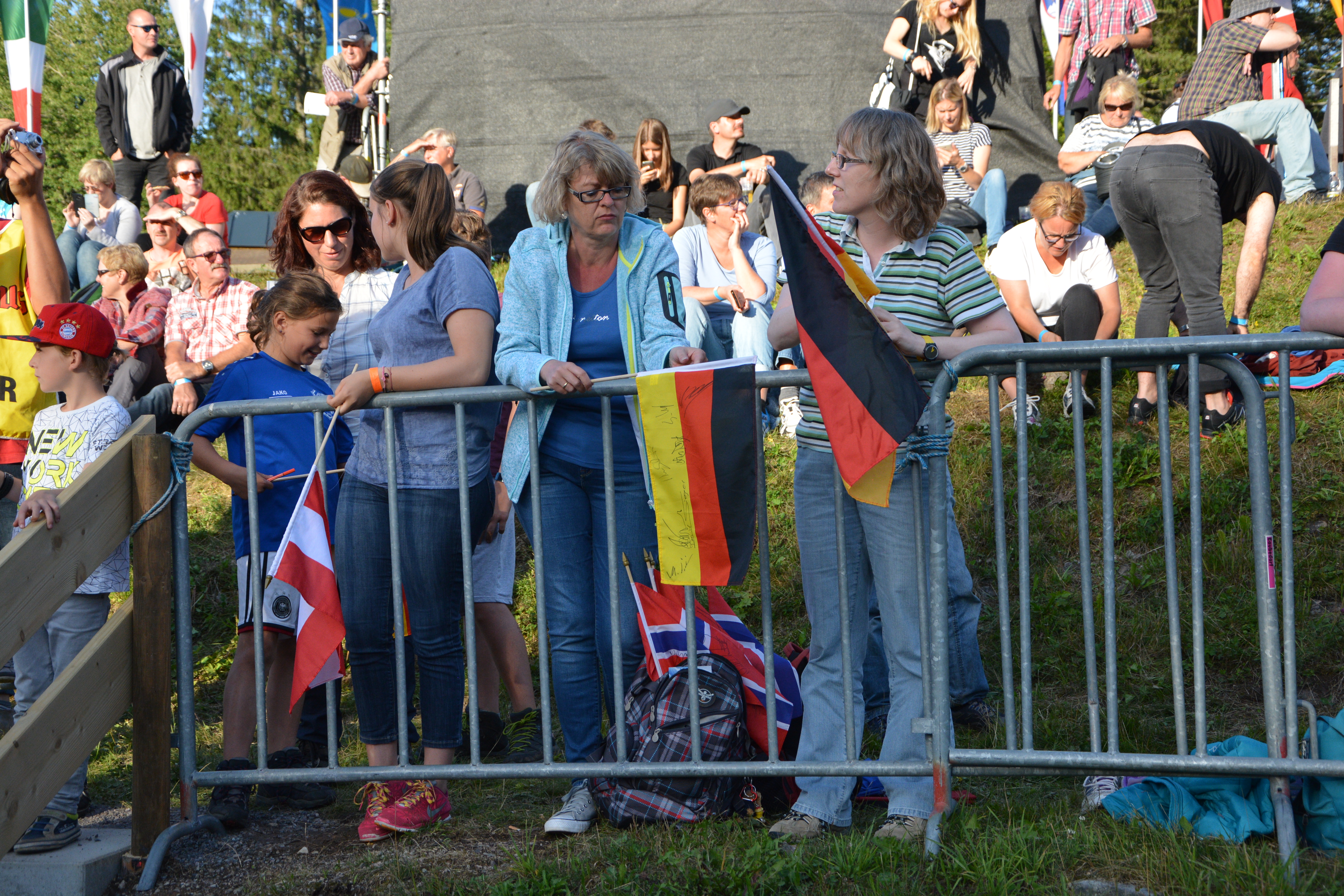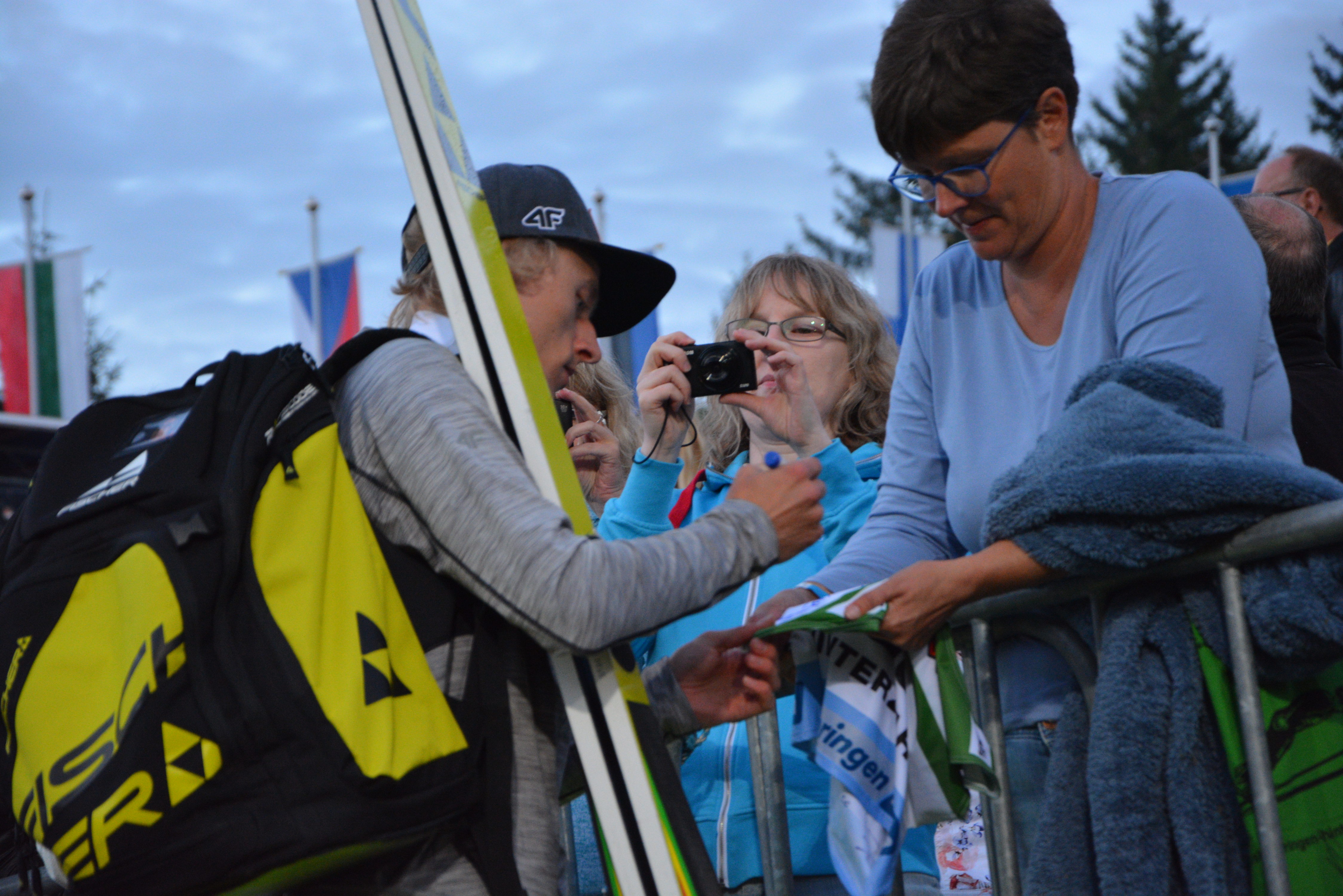 Jak już wcześniej wspomniałam, skoki w Hinterzarten wyglądają bardziej jak piknik, niż poważne zawody. Przed południem mają tam miejsce zmagania dzieci, golfowe turnieje i inne tego typu atrakcje, wieczorem na wszystkich czeka dyskoteka do późnych godzin nocnych. Ludzie oglądają skoki siedząc na skarpach na własnych kocykach i z piwem w ręku. Do tego każdy ma do dyspozycji wiele stanowisk kulinarnych, wśród których znalazłam nawet polskie, serwujące rosyjską soliankę. Publiczność ożywia się jedynie w czasie skoków niemieckich zawodników, o doping dla reszty dbają zagraniczni kibice. No cóż, duży kontrast z tym, co dzieje się chociażby w Wiśle, choć nie brakuje również fanek, które jednak w większości są raczej po pięćdziesiątce.